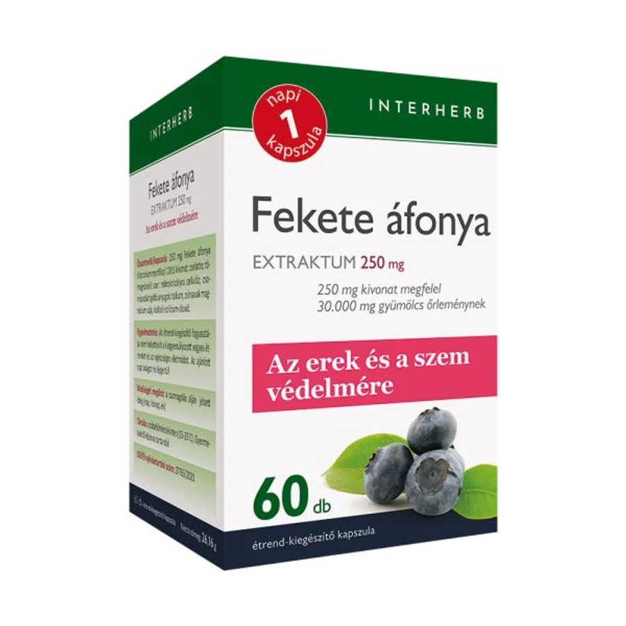 Az Interherb NAPI1 Fekete Áfonya Extraktum kapszulánként 250 mg kivonatot tartalmaz, ami 30 000 mg gyümölcsőrleménynek felel meg. A koncentrált, mégis egyszerűen fogyasztható forma praktikus lehet mindazoknak, akik szeretnék a fekete áfonya jellegzetes összetevőit a napi étrendjükbe illeszteni.