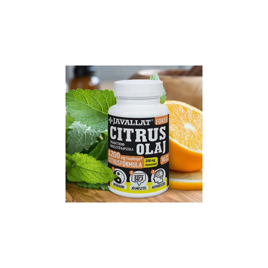 - A napi adagban (2 kapszula) 1200 mg FineDrops® Citrusformula: citrom (Citrus x limon) és édes narancs (Citrus