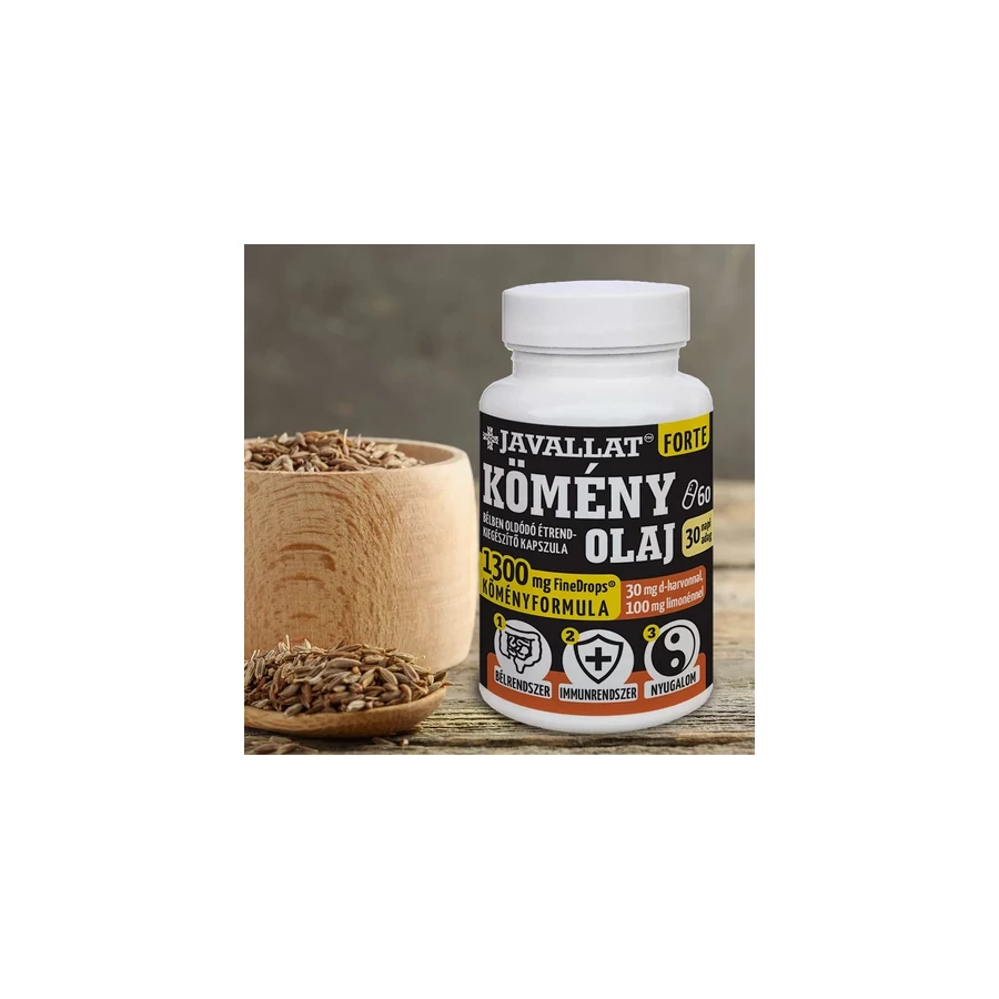 30 adag, összesen 60 db bélben oldódó étrend-kiegészítő kapszula, 1300 mg FineDrops® Köményformulával (30 mg d-karvonra és 200 mg limonénre standardizálva) a napi adagban.