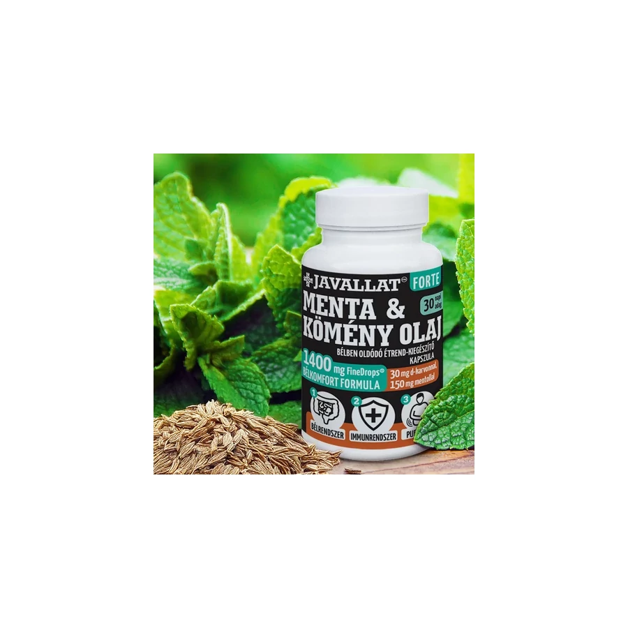 - A borsmenta- és köményolaj együttesen támogatják az egészséges emésztési folyamatokat és hozzájárulnak a bélrendszer komfortérzetéhez. Elősegítik a bélmozgások normalizálását és a megfelelő bélműködést, ami fontos az optimális tápanyag-felszívódás szempontjából is. Csökkenthetik a túlzott teltségérzetet, a puffadást és a gázképződést, hozzájárulva a könnyedebb közérzethez az étkezések után. Természetes mikrobafejlődést gátló tulajdonságaik révén hozzájárulnak az egészséges bélflóra kialakításához. Gyulladáscsökkentő és antioxidáns hatóanyagaik révén támogatják a szervezet védekező rendszerének megfelelő működését. ⇒ Részletes tájékoztató a terméken megjelenő egészséggel kapcsolatos állításokról.