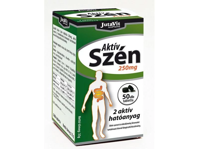 JutaVit Aktív Szén tabletta 250mg, aktív szenet és édeskömény kivonatot tartalmazó étrend-kiegészítő készítmény.