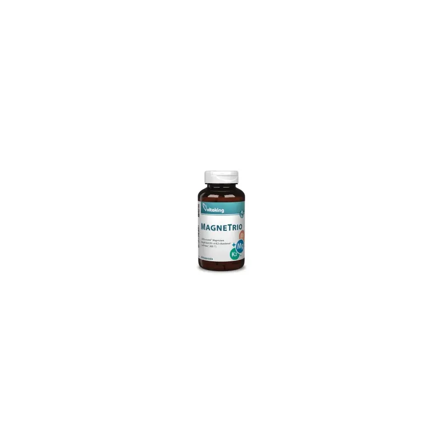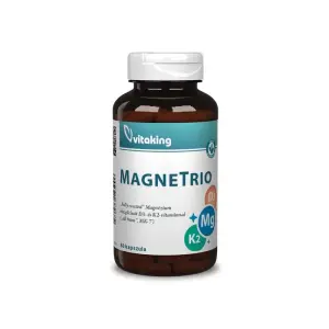 A Vitaking MagneTrio egyetlen kapszulában kiváló minőségben és nagy mennyiségben tartalmaz 3 létfontosságú tápanyagot: magnéziumot, D3-vitamint és K-vitamint legjobban hasznosuló, Menakinon-7 (MK7) formájában. Egyetlen kapszula 90 μg K2-vitamint (MK7), 1000 NE D-vitamint és 100 mg magnézium-biszglicinátot tartalmaz. A komplex készítmény előnye, hogy egy kapszula bevételével biztosíthatjuk mindhárom tápanyag nagy mennyiségben való bevitelét.